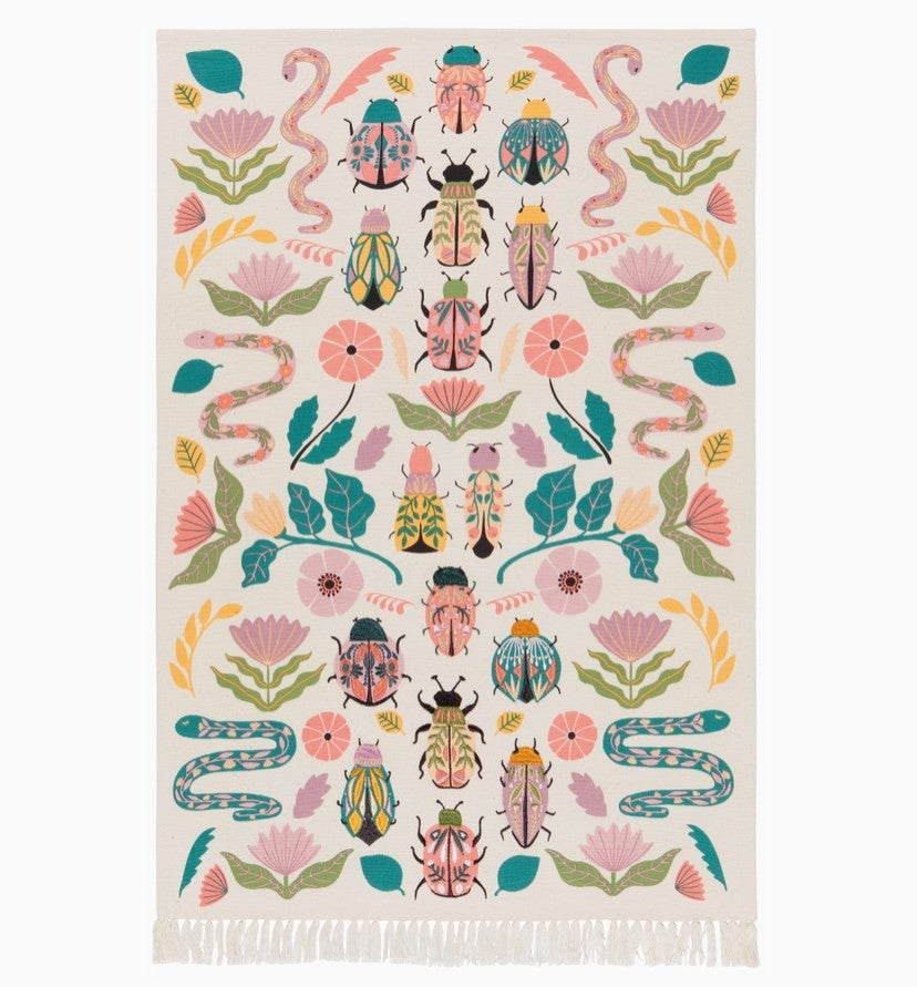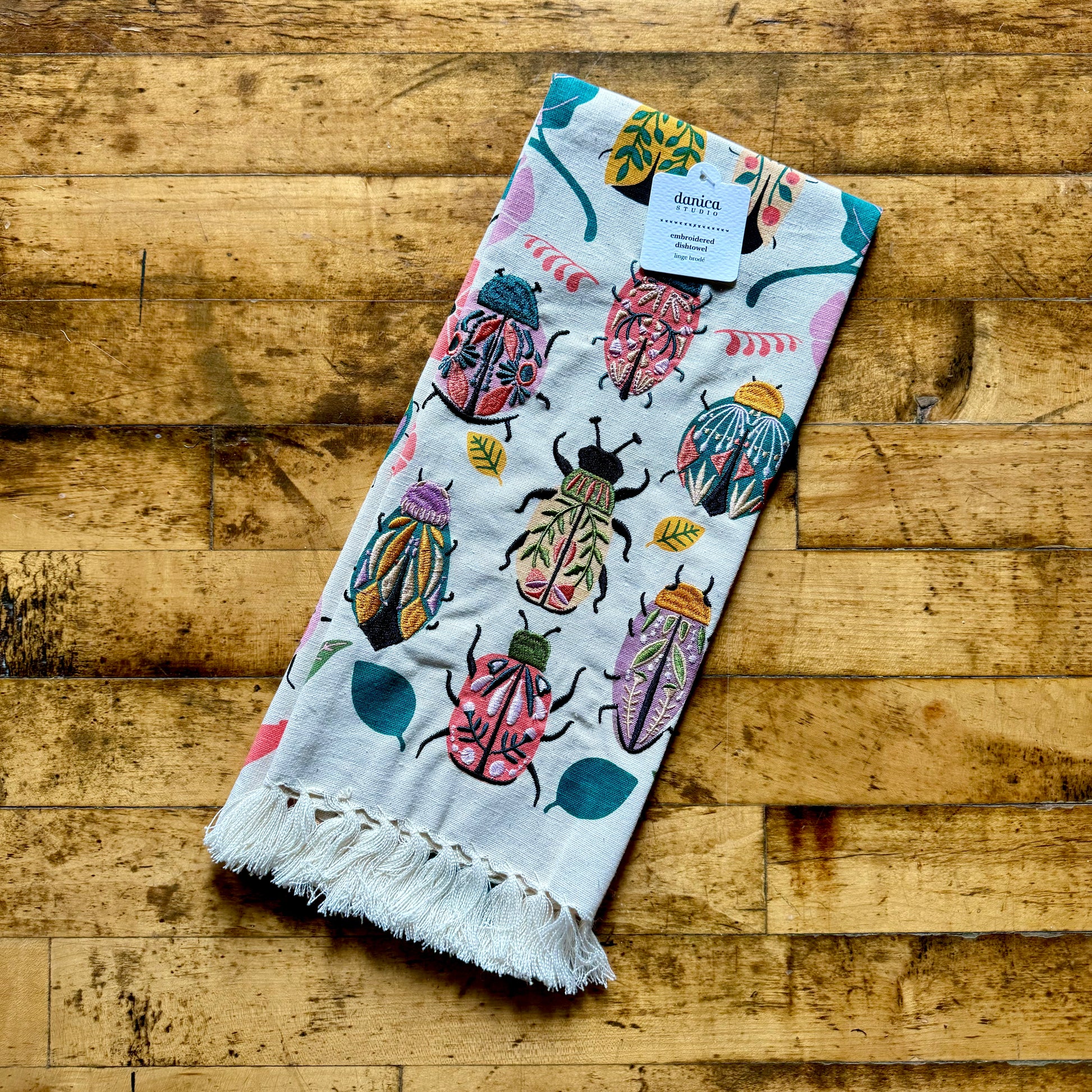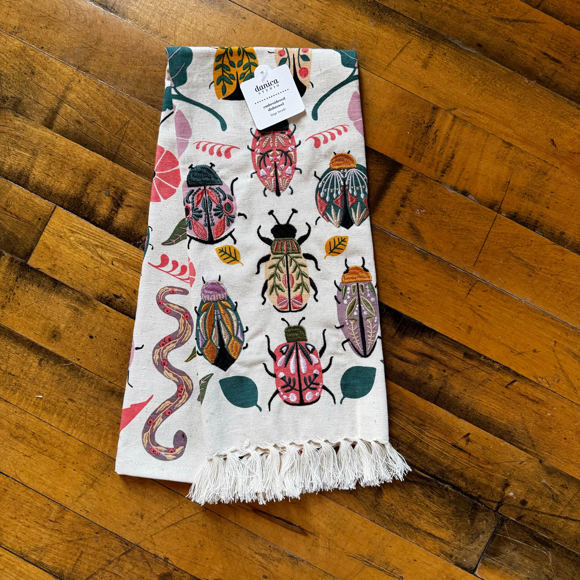 Ensure all your culinary creations come to fortunate fruition by accessorizing your kitchen with this multicolored Amulet Embroidered Dishtowel. Insects, reptiles, flowers and feathers in a gorgeous array of rich hues weave a powerfully protective spell over your cooking efforts, and tasseled trim adds a lighthearted touch.