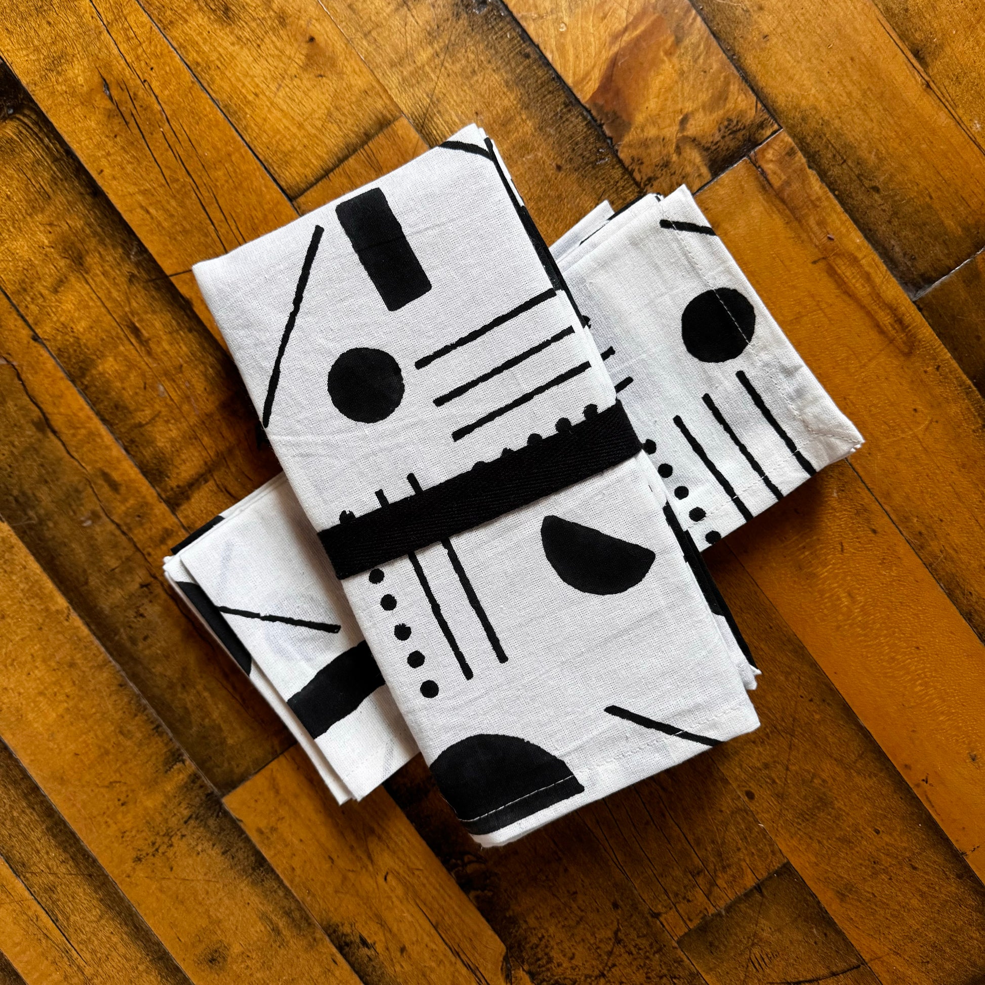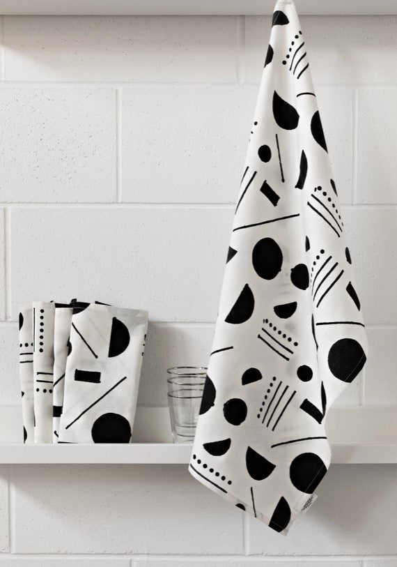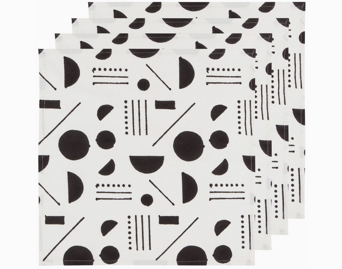 Minimalist black lines, spheres and half-moons sublimely arranged on a clean white backdrop comprise the modern design of this 4-piece Domino Block Print Napkin Set. Set a more cohesive table with a collection of four coordinating dinner napkins. From geometric patterns to foliage-inspired motifs, it's a case of old-world technique meets modern appeal, with a heaping helping of artisanal craftsmanship to bring it all together. Make a distinctive statement with napkins emblazoned with a contemporary print, or choose a brightly colored theme that makes you smile long before the food hits the table. Mix and match several sets for artfully contrasting table décor that exudes warmth, or choose coordinating prints to ensure a more unifying look.
