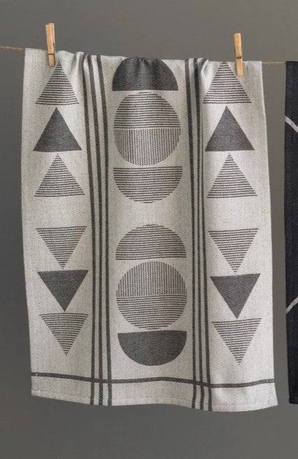 Triangles and half moons converge in symmetry, bringing eye-catching movement to this Eclipse Jacquard Towel. This dishtowel takes on kitchen tasks with a fresh, fantastical point of view. Intricately woven in a captivating lineup of bold geometrics and organic shapes. Each distinctive pattern becomes a sinuous element of the rich jacquard weave. Thick, 100% cotton suits multiple purposes around the home, from drying hands to dishes and glassware. Sumptuously soft and promptly absorbent, these luxurious hand towels may also merit placement in your powder room for guests. 28" x 18"