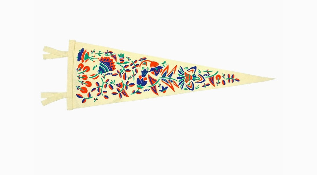A floral patterned pennant is a much more permanent option than live flowers, so why not surprise your loved ones with an everlasting bouquet today? This cream pennant depicts a swirling array of orange, blue, and green flowers that'll delight any recipient. Cut-and-sewn wool felt and screen-printed design.